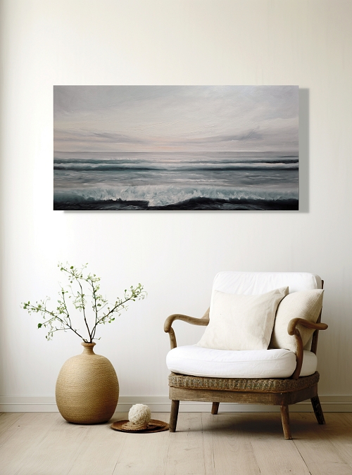 This piece edges toward abstraction, with wave layers rendered in tonal greys and blurred edges. Greywash holds emotional complexity—neither storm nor silence, but that in-between register of thought, tiredness, and emotional honesty. The work offers no fixed point to anchor in; rather, it becomes a surface to project into. This painting is for those who have known both the edge and the return.
